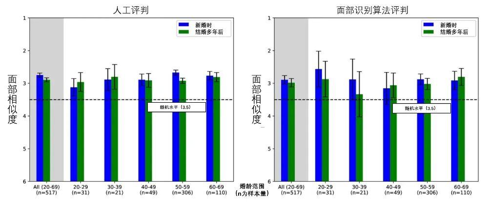 人工和算法評判的結果幾乎一致地發現,所謂的夫妻相確實存在,無論是新婚時期還是結婚多年後,夫妻的面部特徵都比隨機水平更加相似。但是,這些夫妻在結婚幾十年後的相似度,還是與新婚時差不多,甚至有些夫妻的面部相似性在多年後還有輕微的下降。[2]