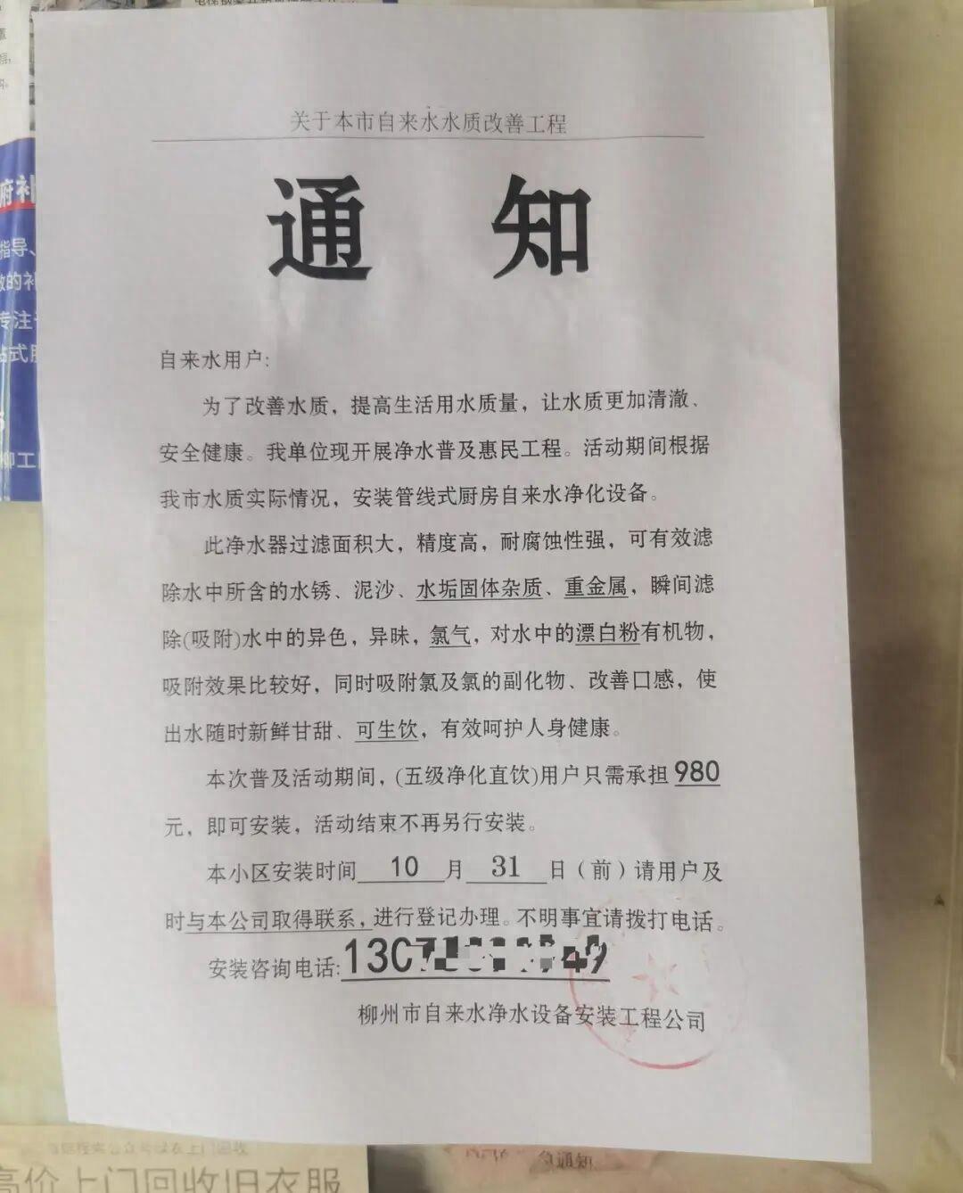 10月29日上午,記者來到河西小區,發現多棟居民樓的樓梯口均張貼有《通知》,部分已被撕去一半。《通知》抬頭印有“關於本市自來水水質改善工程”字樣,內容爲推廣安裝“管線式廚房自來水淨化設備”,聲稱在普及活動期間,用戶只需支付980元即可安裝,並註明河西小區的安裝期限爲“10月31日前”。