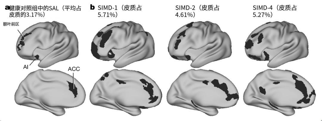 在大量樣本的抑鬱症患者皮層中,前紋狀體顯着網絡擴大了近兩倍。a、顯著性網絡(黑色)在 LPFC、ACC 和 AI 中有代表性。b 、來自數據集的三個代表性個體的顯著性網絡丨參考資料 1