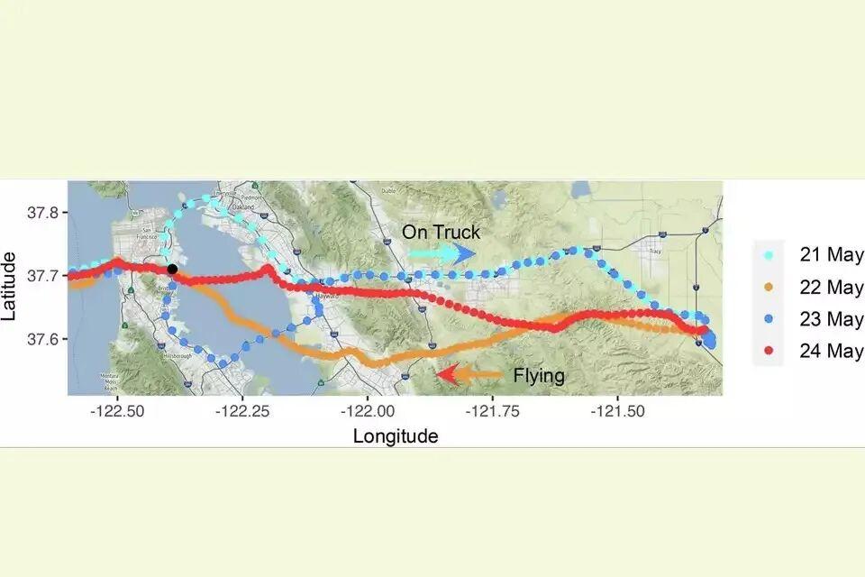 這隻海鷗完全偏離了預期的路線,從舊金山Candlestick Point附近的回收處理站開始,經過海灣大橋,沿着880號州際公路南下,然後轉到580號公路,最終到達了中央谷地Modesto附近的一個堆肥垃圾場。全程約130公里。