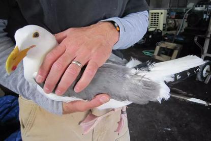 謝弗成功捕獲了這隻海鷗,小心地把它裝進枕頭套裏帶回實驗室。他在它尾巴根部安裝了一個火柴盒大小的GPS追蹤器,還用記號筆在它的額頭點了一個點,方便日後識別。