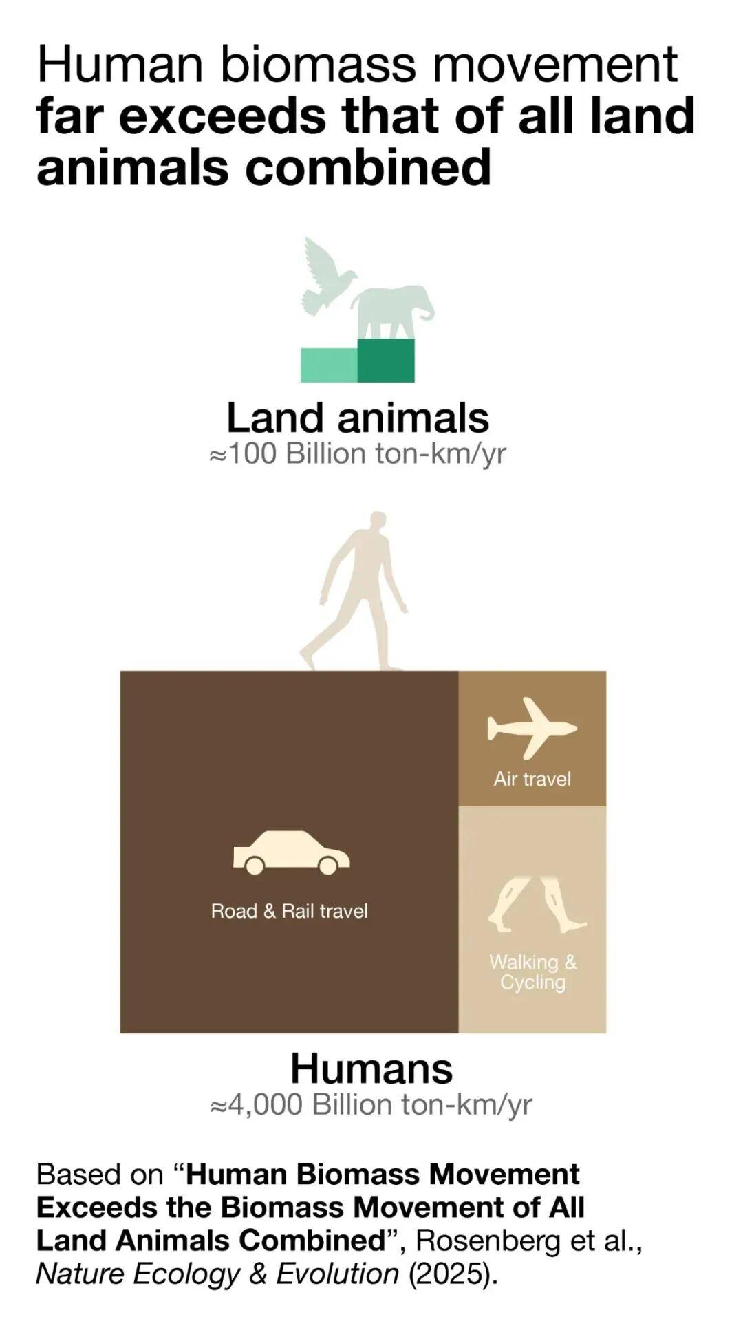 本週發表在《自然·生態與演化》(Nature Ecology & Evolution)的一項研究中,研究團隊分析了已有科學文獻和數百個數據源,發現人類的生物量遷移可能達到所有陸地動物總和的40倍。而同日,另一項發表於《自然·通訊》(Nature Communications)的論文整合多種數據集和評估推算出,自1850年來,人類和家養哺乳動物(如牛和綿羊)生物量增長近5倍,而野生哺乳動物的生物量總和銳減逾半。僅海洋哺乳動物生物量就減少了70%,主要源於較大物種的衰退,如藍鯨、座頭鯨、長鬚鯨和抹香鯨等。