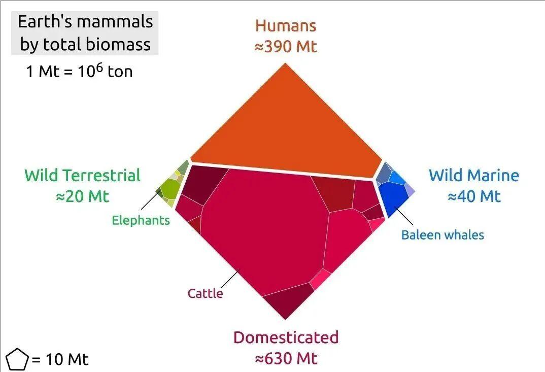 但人類在地球上所佔的份量,已經超越了所有其他生物。2023年發表於《美國科學院院刊》(PNAS)的一篇論文評估了全球哺乳動物的總生物量(可以理解爲生物的質量),結果發現,人類及人類飼養的牲畜和寵物佔了絕大部分,約佔94%。