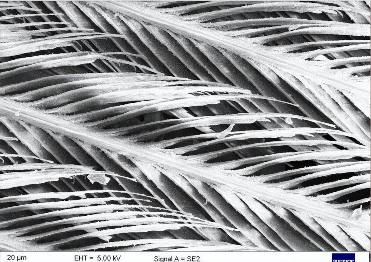 羽小枝與羽小鉤相互交疊在一起的電鏡照片,圖片來源:Wikipedia