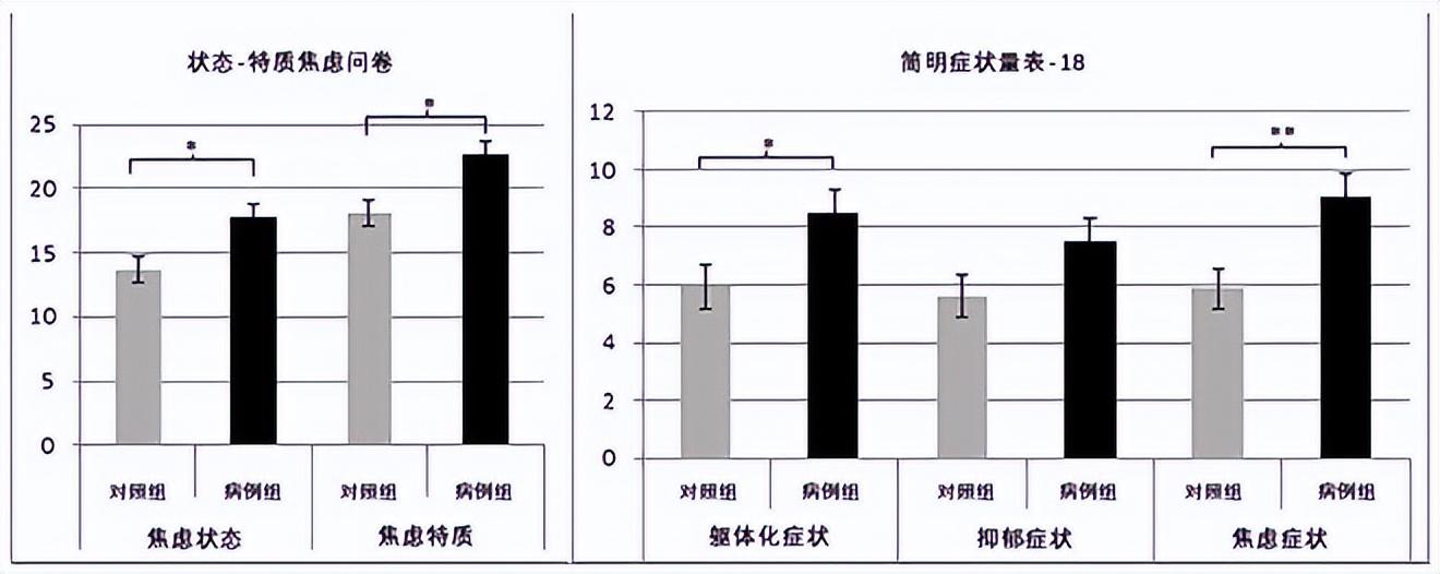 結果發現,比起對照組,病例組表現出了明顯更高水平的焦慮、抑鬱和軀體化症狀(即一些沒有明確病因的身體不適症狀,如頭痛、肌肉痠痛和頭暈等,一般認爲是心理困擾的外化表現)。同時,STAI 評估的結果還顯示病例組不僅表現出了較高的焦慮狀態,而且有着更強的焦慮特質,這指的是個體長期的焦慮傾向,被認爲是一種相對穩定的人格特質。