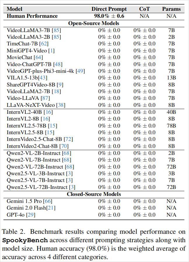 無論模型架構大小、訓練數據規模、是否經過微調或採用何種提示策略,AI從未答對任何一段視頻的內容。