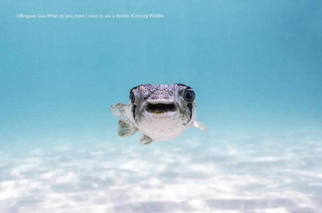 攝影師Bingqian Gao在加利福尼亞灣的淺水區發現了這隻河豚。它的嘴一直張着,好像永遠處於震驚狀態。她後來意識到,這隻河豚沒法閉上嘴巴,是因爲嘴裏已經長出了一層厚厚的藻類。