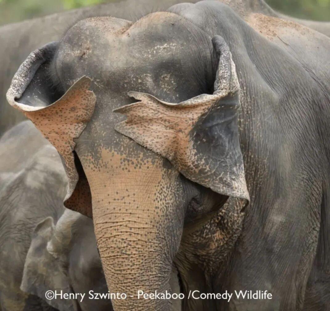 一頭斯里蘭卡大象在用大扇耳朵玩躲貓貓。