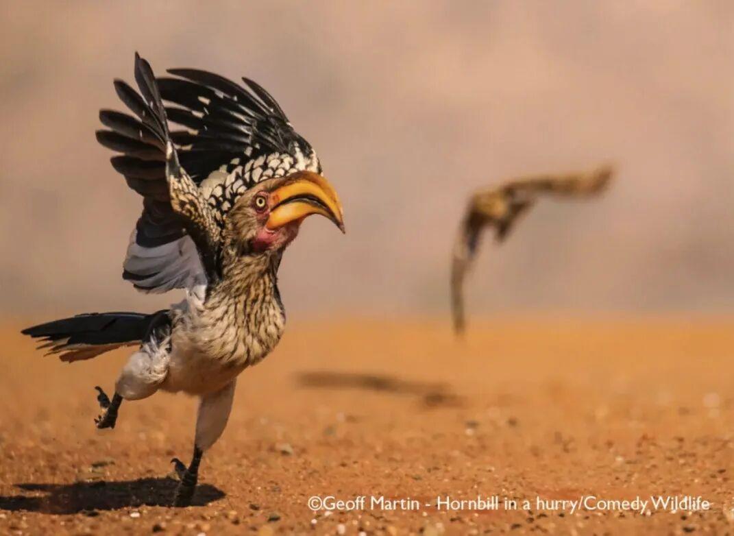 在南非齊曼加(Zimanga)的一處隱蔽拍攝點,攝影師Geoff Martin正在耐心等待他想要拍攝的主角——白背禿鷲。然而,白背禿鷲還沒出現,一隻南方黃嘴犀鳥卻突然闖入鏡頭,穩穩停在前面,擋住了所有拍攝禿鷲的視線。這時,一隻慄翅鷹從右側迅速掠過,似乎把犀鳥嚇了一跳,犀鳥便逃命般狂奔起來。