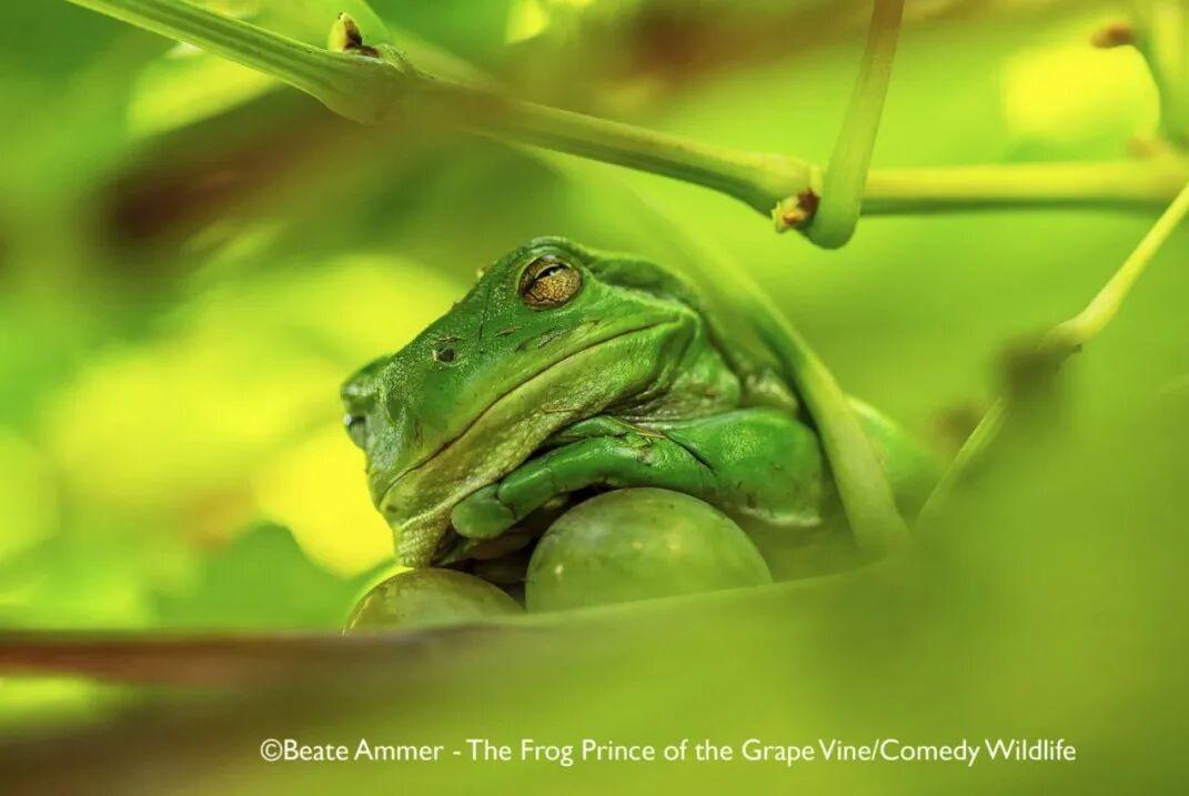 “青蛙王子”懶洋洋地趴在葡萄藤下,似乎把藤蔓和飽滿的葡萄當成了自己的王宮。