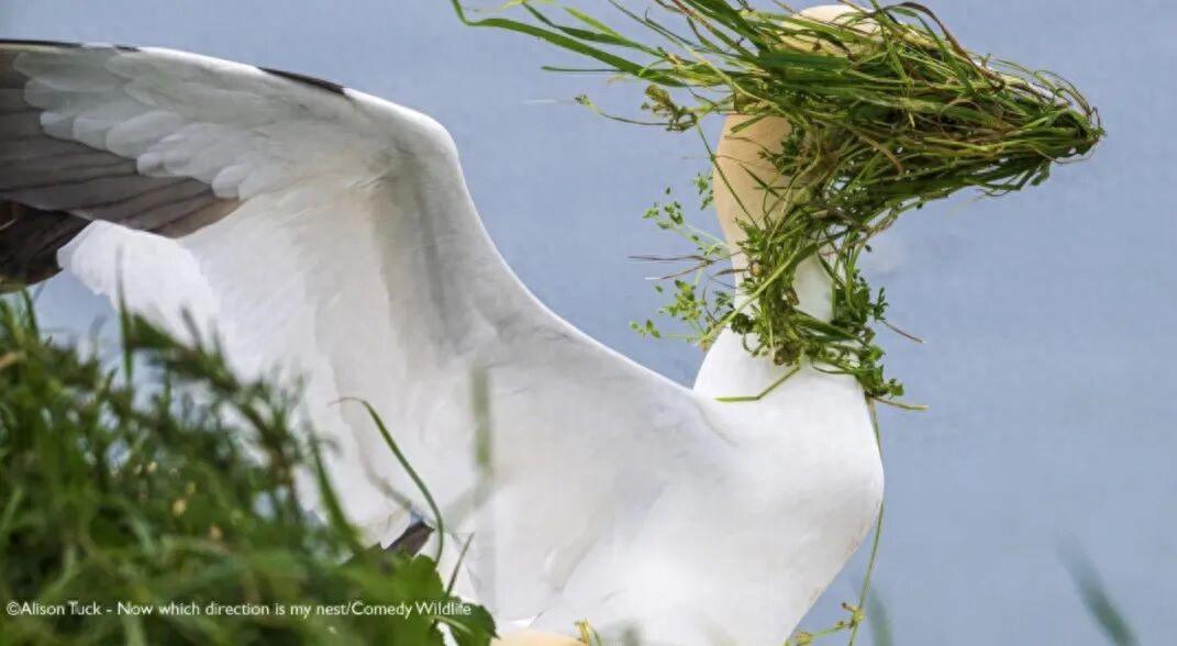 攝影師Alison Tuck在英國貝姆普頓懸崖(Bempton Cliffs)捕捉到了這個搞笑瞬間:一團草正好拍在一隻倒黴鳥上。