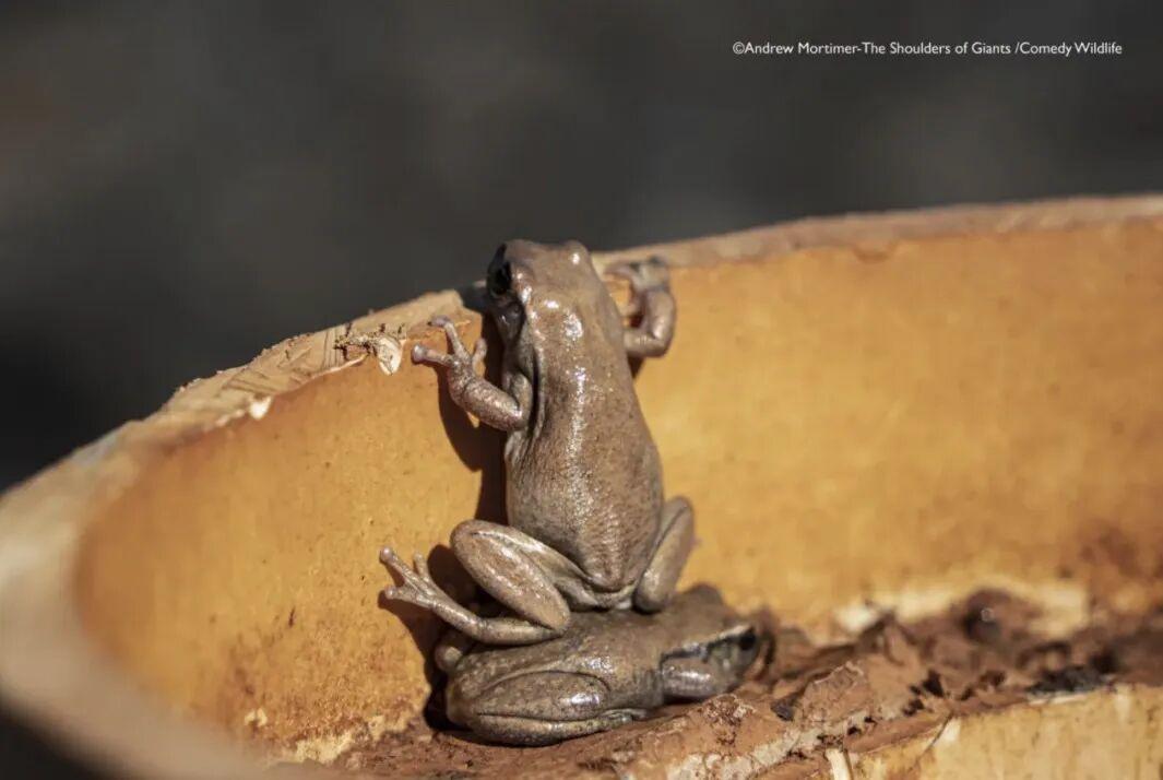 這羣青蛙住在一處礦區的鑽孔套管裏。攝影師Andrew Mortimer寫道:“它們的個頭太矮,看不到套管外的世界,只能想盡辦法往上擠。”這個辦法,就是站在另一隻蛙蛙的背上。