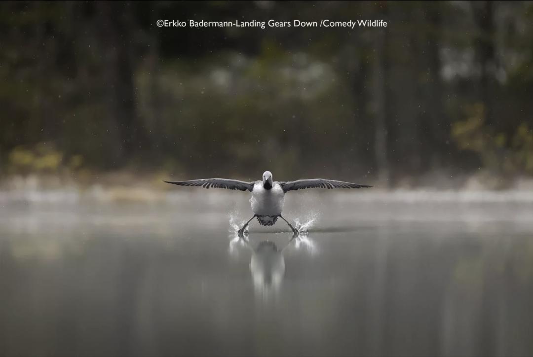 攝影師Erkko Badermann表示他拍攝紅喉潛鳥已經好幾年了,有時候會躺在池塘邊緣的僞裝網下,從隱蔽處拍攝它們春季的求偶表演。在一個雪霧交織的清晨,他拍到了這張飛鳥着陸的搞笑場景。