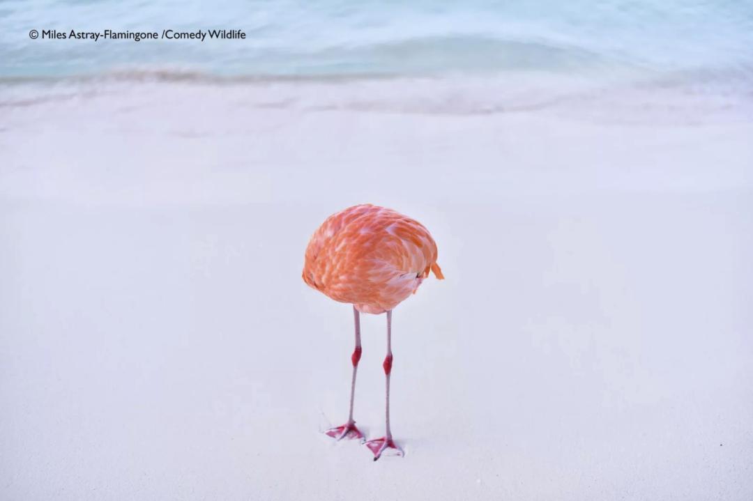 這可不是AI生成的無頭火烈鳥圖片。這隻火烈鳥在加勒比海灘上進行晨間護理工作——把頭埋在身子裏來清潔羽毛。你能找出它的頭在哪兒嗎?