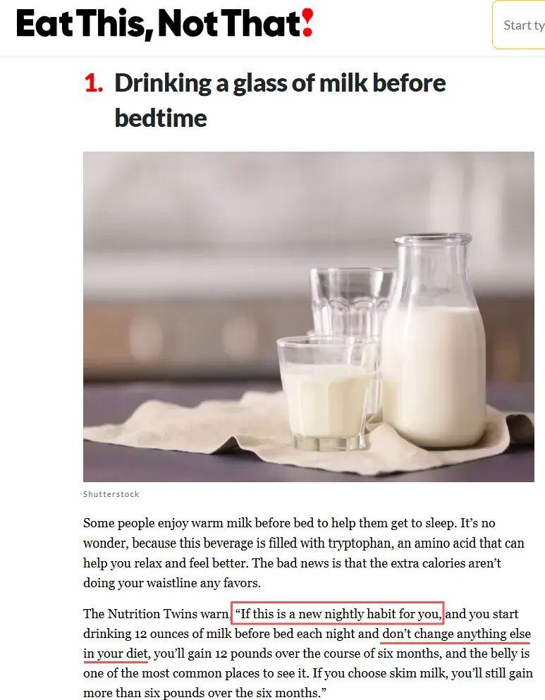這段話出自美國《喫這個,不喫那個!》(Eat This,Not That!)雜誌,其中雖然提到“夜間喝牛奶的習慣,會暗中增加腹部脂肪”,但這裏明確指出的是:如果將睡前喝牛奶作爲新的夜間習慣,纔會增加體重。當你開始每晚睡前喝 12 盎司(約 354 毫升)牛奶,並且不改變飲食中的任何其他東西,那麼你會在 6 個月內增加 12 磅(10.89 斤),而腹部是最常見的部位之一。如果你選擇脫脂牛奶,你仍然會在六個月內增加 6 磅(4.44 斤)以上。[1]