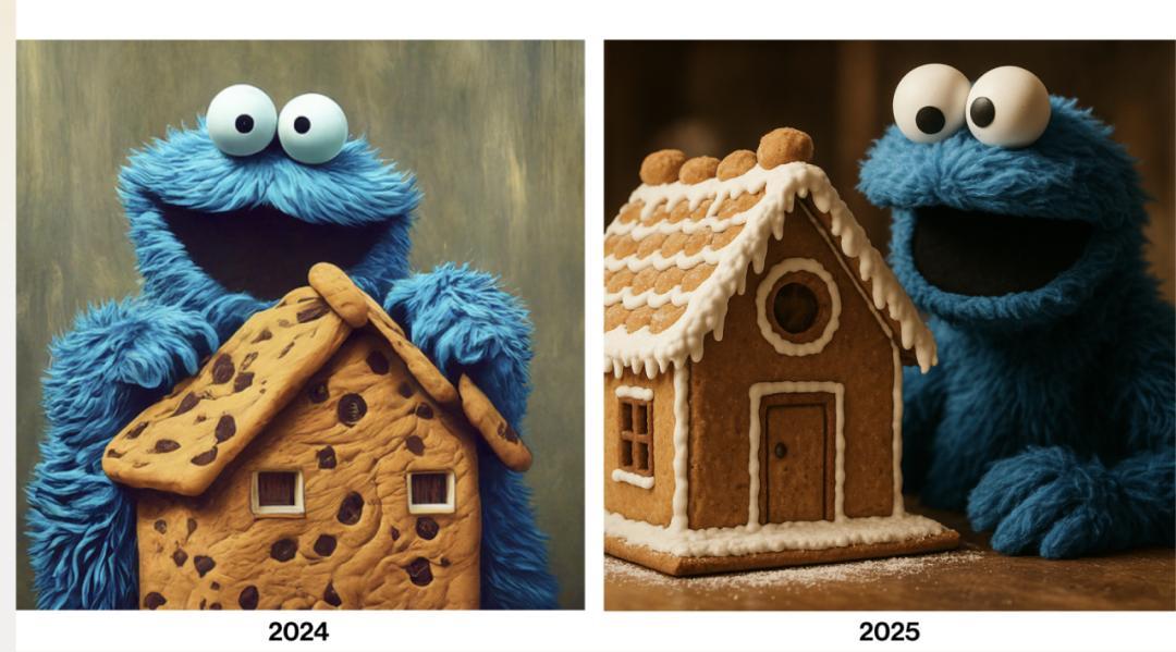 新的模型和工具開始內置更多“理解”維度:語義、構圖、風格、版式邏輯。根據missioncloud一篇對比分析,2025年圖像生成在真實感、細節掌握、紋理區分上比2024年提升明顯,比如下面例子:2024圖像還塑料感十足,2025版本的毛髮、布料、光影都顯得真實可觸。