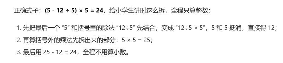大模型B的答案是(5+5)×12÷5=24。算式和答案都正確,但在提供解題思路時,大模型說算式“(5+5)÷5×12”不對,可這兩個算式都正確。