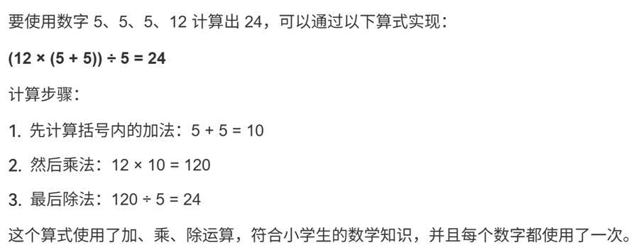 大模型C的答案是(12×(5 + 5))÷5=24。總體正確,但根據書寫規範,算式多了一個括號,應當是12×(5 + 5)÷5。