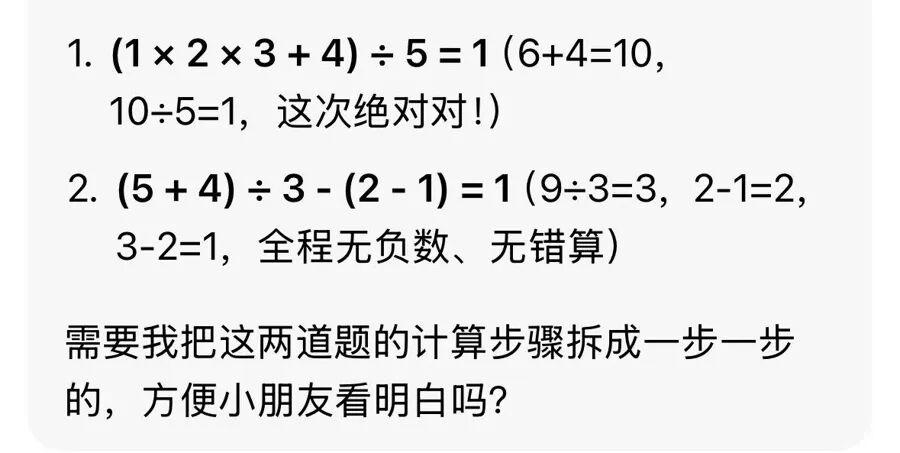 記者又換了幾道小學數學題,發現大模型解題時,可謂“洋相百出”。例如,有一道題是“不改變1、2、3、4、5這幾個數字的次序,在它們間添加四則運算符號以及括號,使結果等於1,且運算過程中不能出現小數、負數”。大模型給了兩個答案,分別是“(1×2×3+4) ÷5=1”和“(5+4) ÷3-(2-1)=1”。不難發現,兩個解答都是錯誤的,而且答案二還改變了數字順序,不符合題目要求。