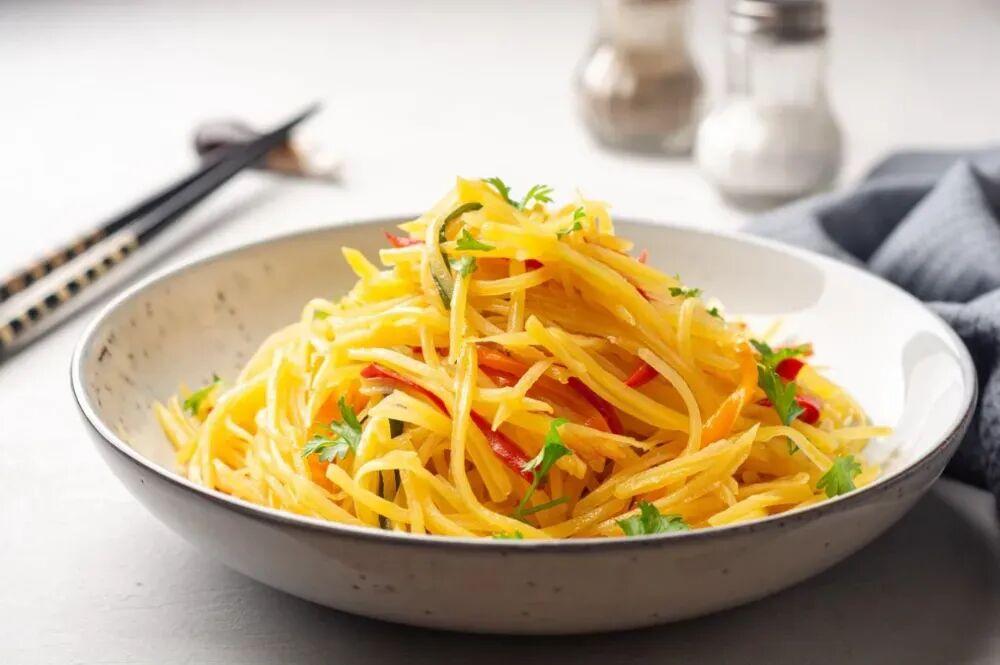 把切好的土豆絲、土豆片泡在水裏,可以洗掉一部分澱粉,讓口感爽脆,不要泡太久,會造成水溶性維生素的流失哦。