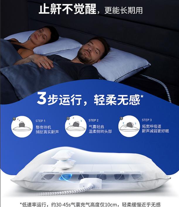 添眠止鼾枕,模擬了側睡的方 法。 當你打鼾時,止鼾枕會輕輕轉動頭部,拓寬氣道,改善被阻塞的呼吸道通氣狀態,從而達到止鼾目的。