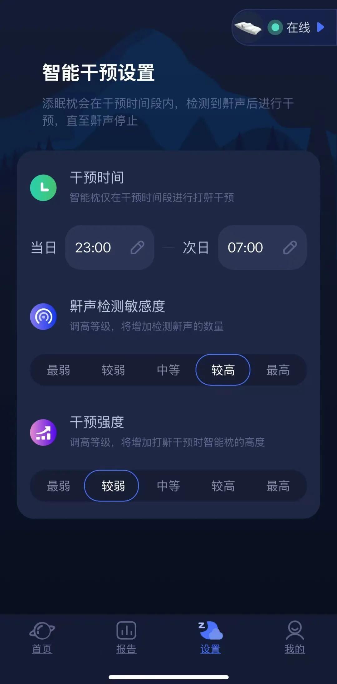 比如用了一段時間後,報告顯示打鼾頻率和強度降低, 就可以相應調整止鼾枕的干預強度/檢測靈敏度,時刻做到1對1的專屬定製!