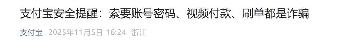 支付寶安全提醒:天上掉餡餅必定是陷阱,不要泄露賬號密碼,不要視頻掃碼收錢,不要刷單掙錢。