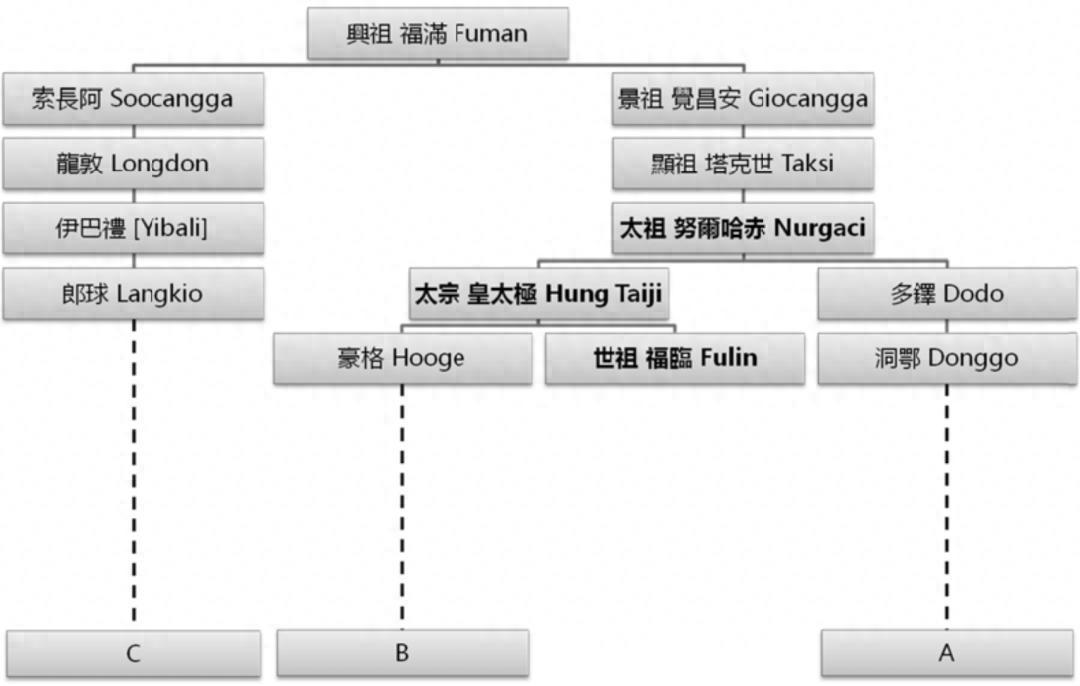 A和B的最近共祖是努爾哈赤,C的祖先爲索長阿。