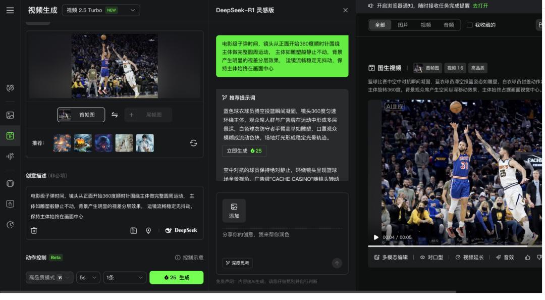 但我得說句實話,現在視頻生成基本還是得靠抽卡,通用提示詞效果也挺中規中矩的……所以建議你讓可靈自帶的 DeepSeek 針對具體的場景給你潤色潤色,這樣成片率能高不少。