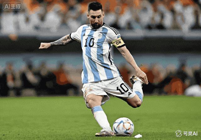 翻出一張梅西踢球的照片——那種經典的射門瞬間,一條腿抬起,球衣隨着動作飄起來。同樣的操作,這次把提示詞裏的細節換成足球場景,藍白條紋球衣、隊長袖標這些標誌性元素都寫進去。