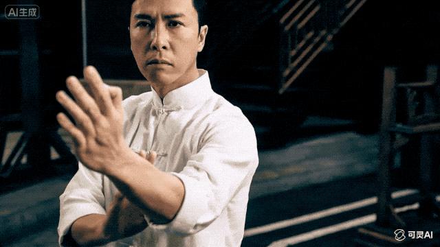 提示詞:武術動作凝固在發力瞬間,白色衣袂靜止,鏡頭順時針完整環繞拍攝,古建築背景的木質欄杆與磚牆紋路呈現流暢的錯位移動,主體眼神始終鎖定鏡頭中心點。