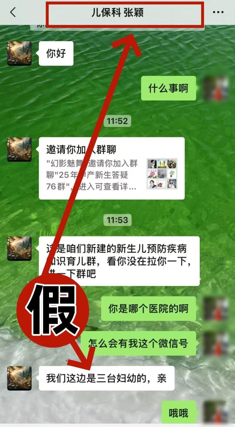詳情:近日,我院發現有名爲“兒保科—張穎”、母嬰育兒-範老師”的微信號,以及邀請進“25年孕產新生答疑76羣”微信羣等手段,冒充我院醫生進羣行騙,主要通過僞造身份、虛假宣傳保健品或藥品、誘導消費等手段實施詐騙。