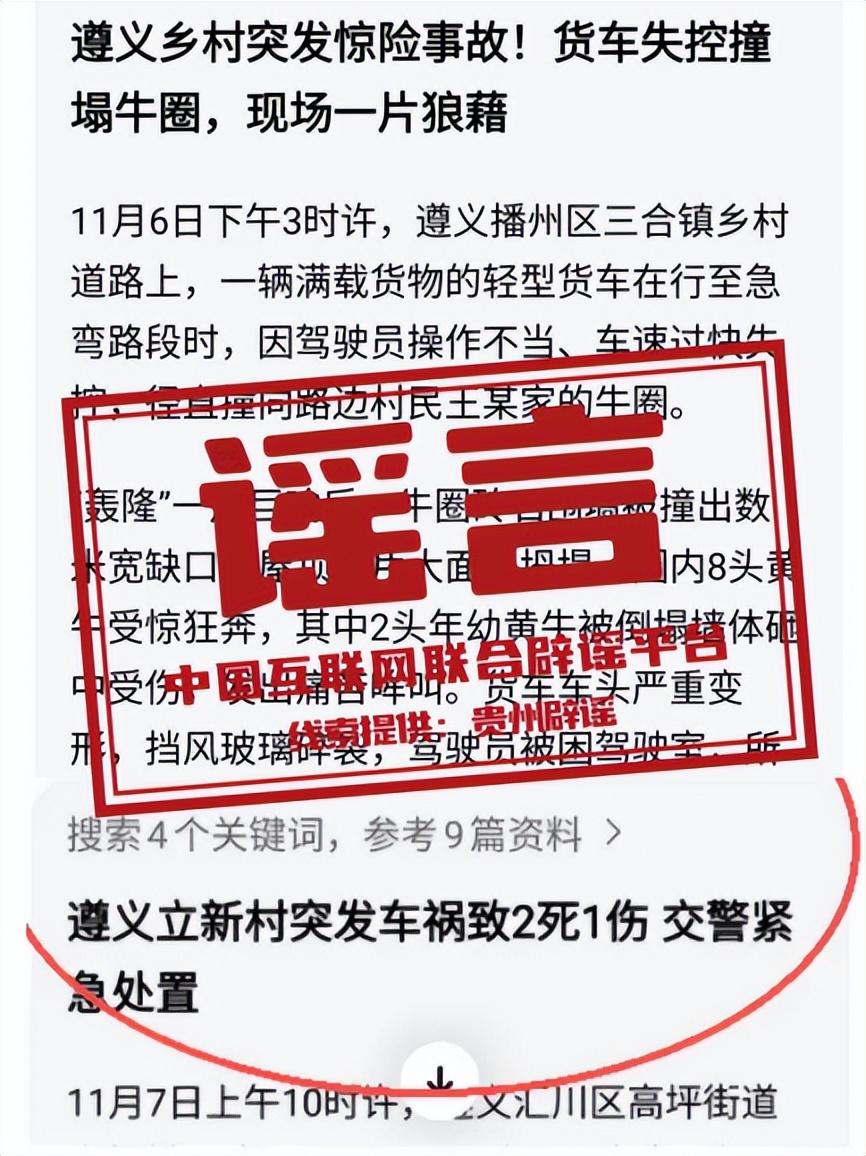 詳情:近日,有網民在網絡平臺發佈“貴州遵義匯川區高坪鎮發生一起交通事故,導致兩死一傷”“貴州遵義播州區三合鎮貨車失控撞向牛圈”信息,引發關注。經覈實,上述信息均爲謠言,系網民楊某爲博取關注,利用AI工具刻意虛構內容。目前,公安機關已依法對其處以行政罰款的處罰。