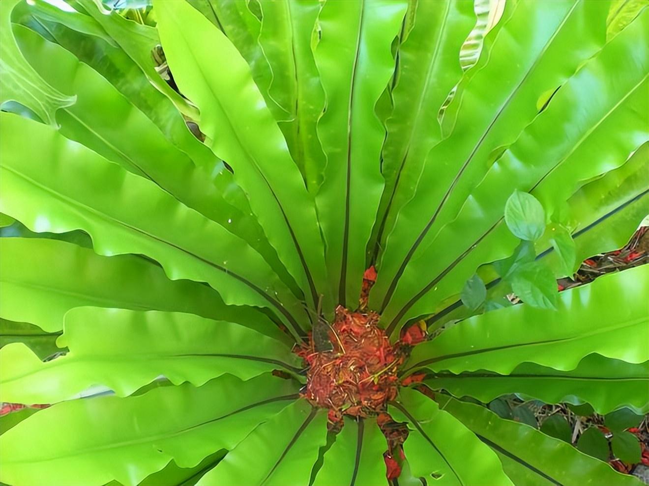 巢蕨外形美觀,現在已經培育出了諸多琳琅滿目的觀賞品種。它的植株高約1-1.2米,有着粗短直立的木質根莖,附生一大團氣根,寬大碧綠的革質葉片自圓形基座長出,從中心向周圍展開,呈漏斗狀。這種宛如鳥巢的葉片結構,可以幫助它承接雨水和落葉,轉化成腐殖質,爲自己提供營養,也爲它與別的植物和諧共生創造了有利條件。
