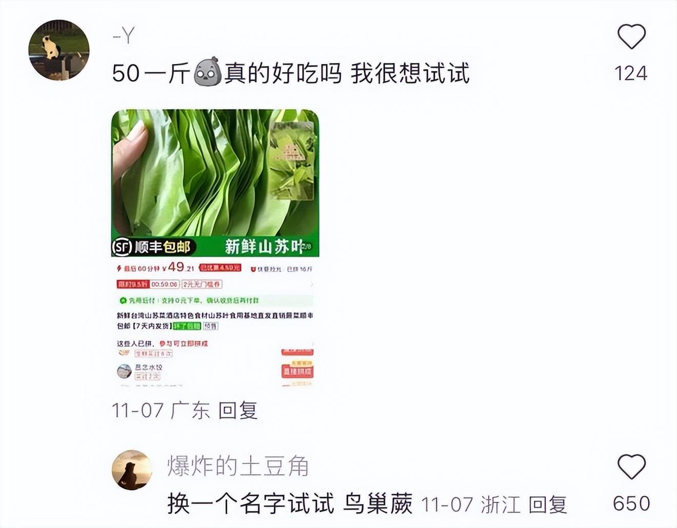 這個奇奇怪怪的植物究竟是什麼?評論區有“老喫家”公佈了答案:它叫山蘇,也叫鳥巢蕨,價格可以說是頗有一些昂貴了。