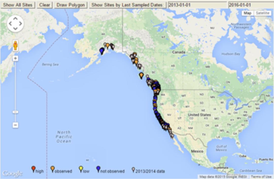 2013-2016年發生海星消融病的地點丨美國地質調查局USGS