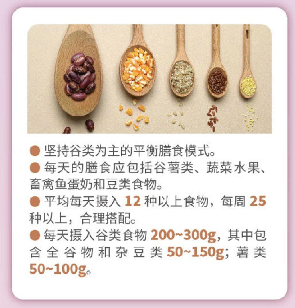 《中國居民膳食指南(2022)》也有明確建議,每天堅持穀類爲主的平衡膳食模式,每天攝入穀類食物200~300g,喫全穀物和雜豆類食物50~150g。