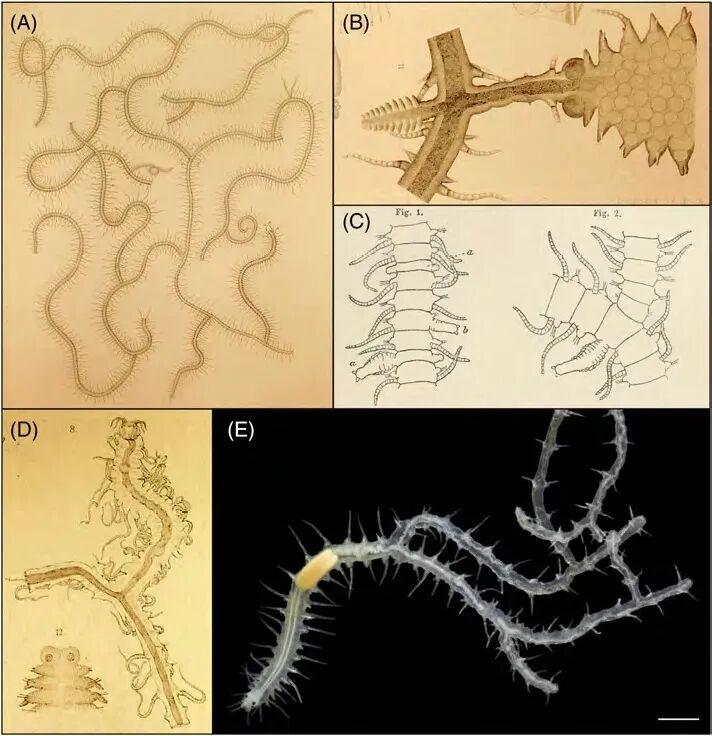 具有奇特分叉狀身體的裂蟲科,A,Syllis ramosa 身體的一部分;B,Syllis ramosa 分叉的局部,右側是一個生殖節,裏面充滿卵;C,Syllis ramosa 在不同發育階段的分支;D,Syllis ramosa 的前端(8)和一個雌性生殖節的前端(12),這可能是唯一一個Syllis ramosa 的頭的繪圖;E,另一種分叉的裂蟲 Ramisyllis multicaudata,圖源:參考文獻 [2]