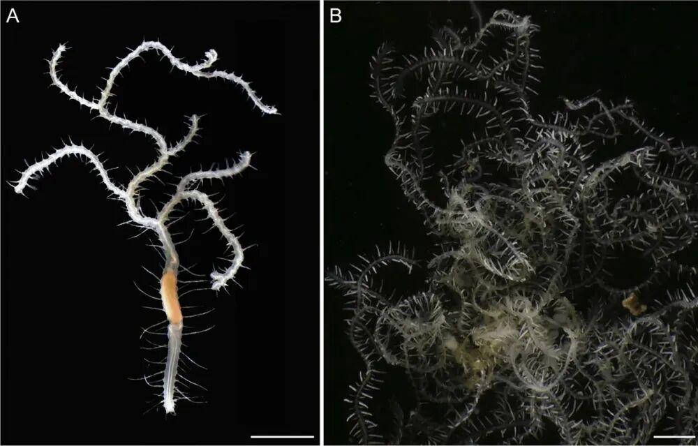 學名 Ramisyllis kingghidorahi 的裂蟲科,A,Ramisyllis kingghidorahi 的身體前端;B,身體局部;圖片來源:參考文獻 [3]