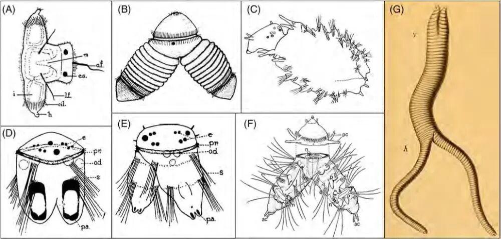 環節動物的畸形胚胎,A 至 F 是各種環節動物的雅努斯(Janus)胚胎,分別來自毛翼蟲屬(Chaetopterus)、小頭蟲(Capitella capitata)、褐片闊沙蠶(Platynereis dumerilii)、琥珀刺沙蠶(Alitta succinea)、杜氏闊沙蠶(Platynereis dumerilii);G是雙胸蚓屬的(Bimastos rubidus)十字聯體畸胎,身體中間相連,但有兩個頭和兩個末端;圖源:參考文獻 [1]