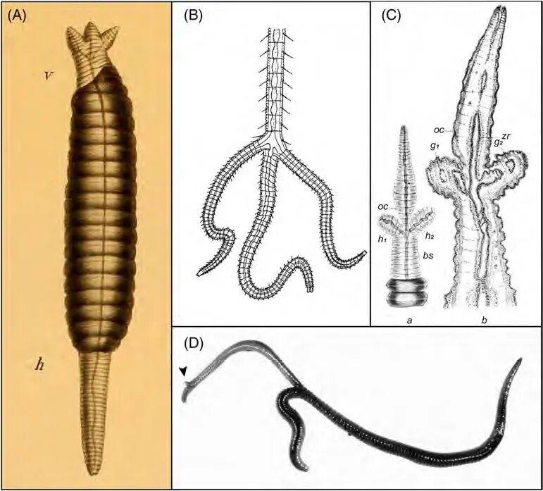 有三個叉的環節動物,A,三個頭的普通蚯蚓;B,三個身體末端的正顫蚓;C,學名 Criodrilus lacuum 的蚯蚓,有兩個頭和一個身體末端;D,尤金真蚓,身體後段分叉,可見其中一個末端又出現一個小分叉;圖源:參考文獻 [1]