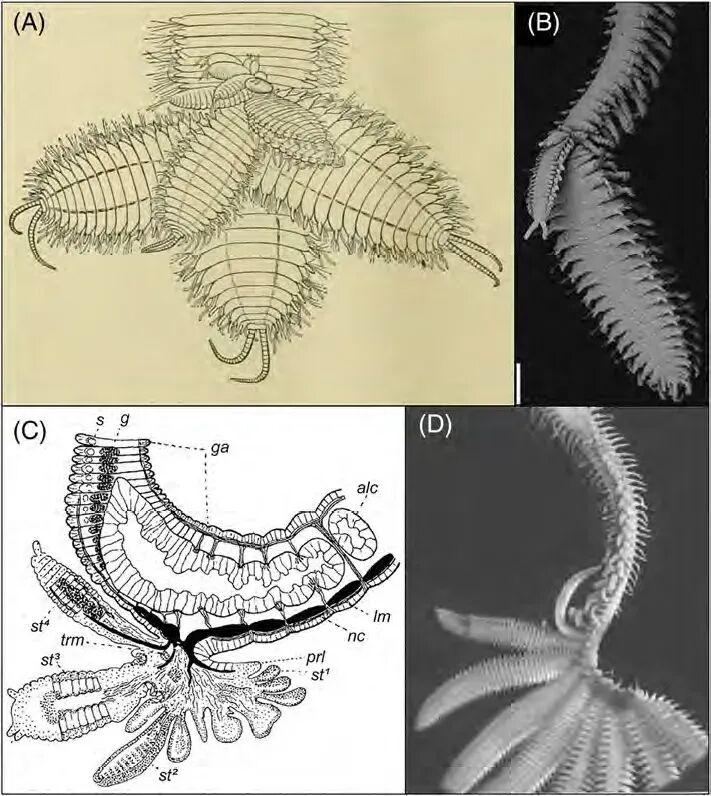 19 世紀 70 年代,英國軍艦挑戰者號 Challenger 進行的考察中,發現了一種居住在海綿裏的裂蟲科沙蠶(Syllis ramosa)。最早研究它的科學家之一,麥金託什(William C. McIntosh)發現它有一個正常的頭,後面的身體卻不斷分叉,分叉再分叉,形成一個錯綜複雜的樹枝狀結構。每個“樹枝”都是結構完整的身體後半段,末端有肛門,內部還有發育完全的腸子。