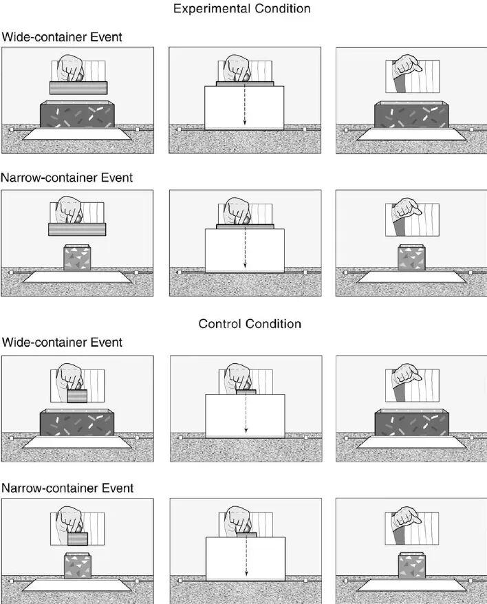 圖示的上面部分流程,實驗者將木塊放到大盒子裏,揭開白板後,嬰兒並沒有表示震驚,因爲它展示的是一個符合預期的情況:木塊可以被較大的容器裝下,所以就看不見了。