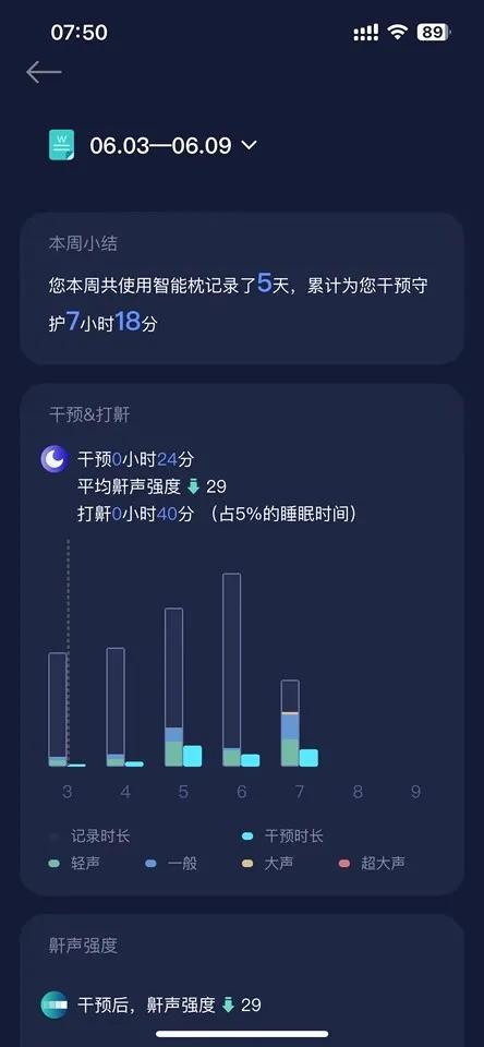 看同事使用5天后,根據app的追蹤記錄顯示,鼾聲強度降低了近33%!
