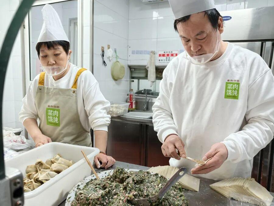 童純忠說,盛興的菜肉餛飩之所以有特點,與餡、皮、湯都有關係。比如,很多人覺得薺菜鮮肉餡好喫,卻不知道這裏的薺菜餡裏添了一點青菜,因爲薺菜偏幹,加入含水量略高的青菜後,內餡口感更好。再如,他們堅持用自家工廠生產的“黑皮子”,就是全麥麪粉佔比較高的餛飩皮,含有一定量的食用鹼水,喫起來更有韌性。看似清澈的餛飩湯,由後廚每天用雞肉、雞爪、豬筒骨等小火慢燉;餛飩上桌前,還要淋一小勺現熬的“靈魂豬油”。