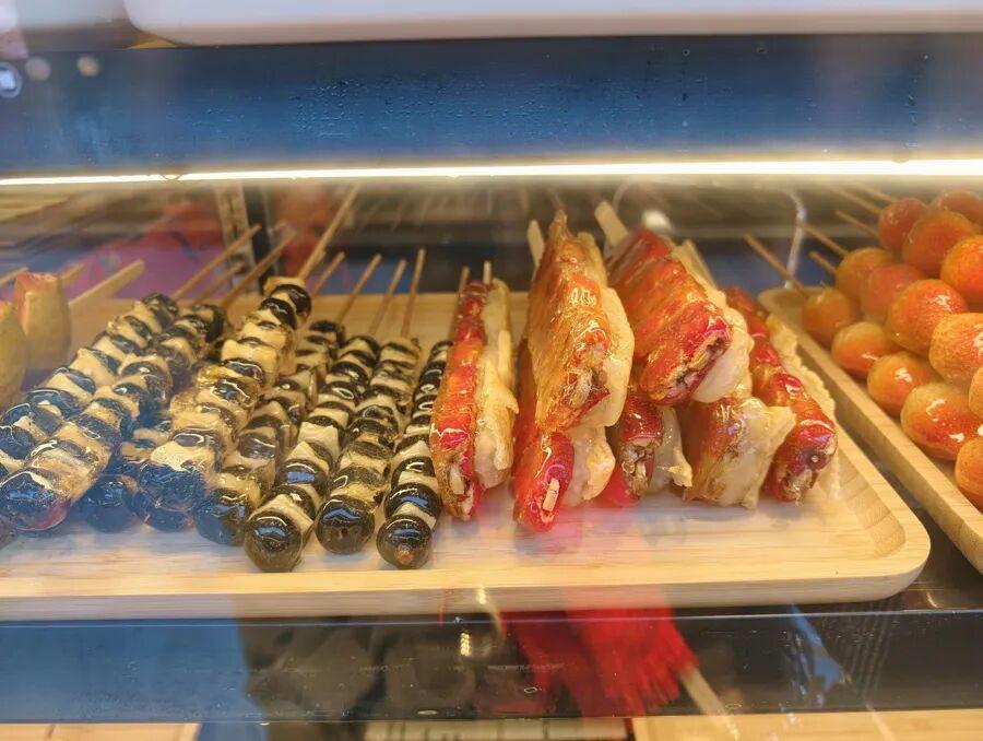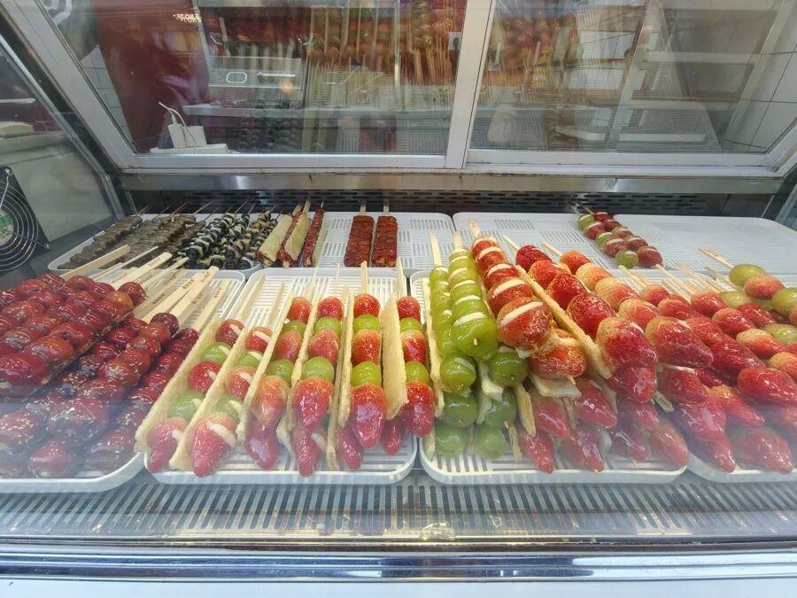 在吳江路美食街,兩家比鄰的小店都銷售奶皮子糖葫蘆,種類也不少,但沒有一家排隊或限購,隨到隨買。