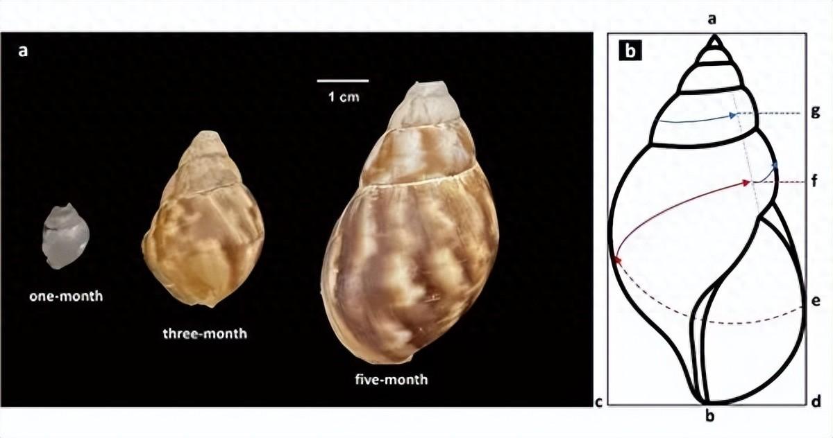 (a)實驗室培養的不同⽣⻓階段的⾮洲⼤蝸⽜(Achatina fulica);(b)蝸⽜殼體形態參數測量示意圖。(圖片來源:參考文獻1)
