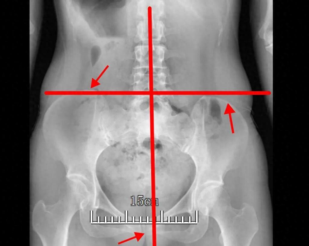 骨盆不水平的另一個影響是可能導致脊柱代償性側凸。所以,如果發現自己有骨盆不水平,可以去檢查脊柱全長片,以排查脊柱全段的姿勢問題。