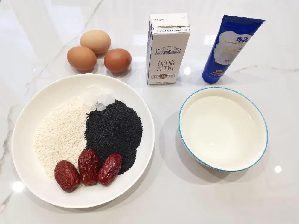 黑芝麻糊部分:糯米 100 克(糯米也可以不放,或替換爲山藥、黑米、大黃米等食材)、黑芝麻(純的)90 克、紅棗 3 顆、冰糖 40 克(不喜歡太甜或者血糖高的人建議減量)、清水 450 克。