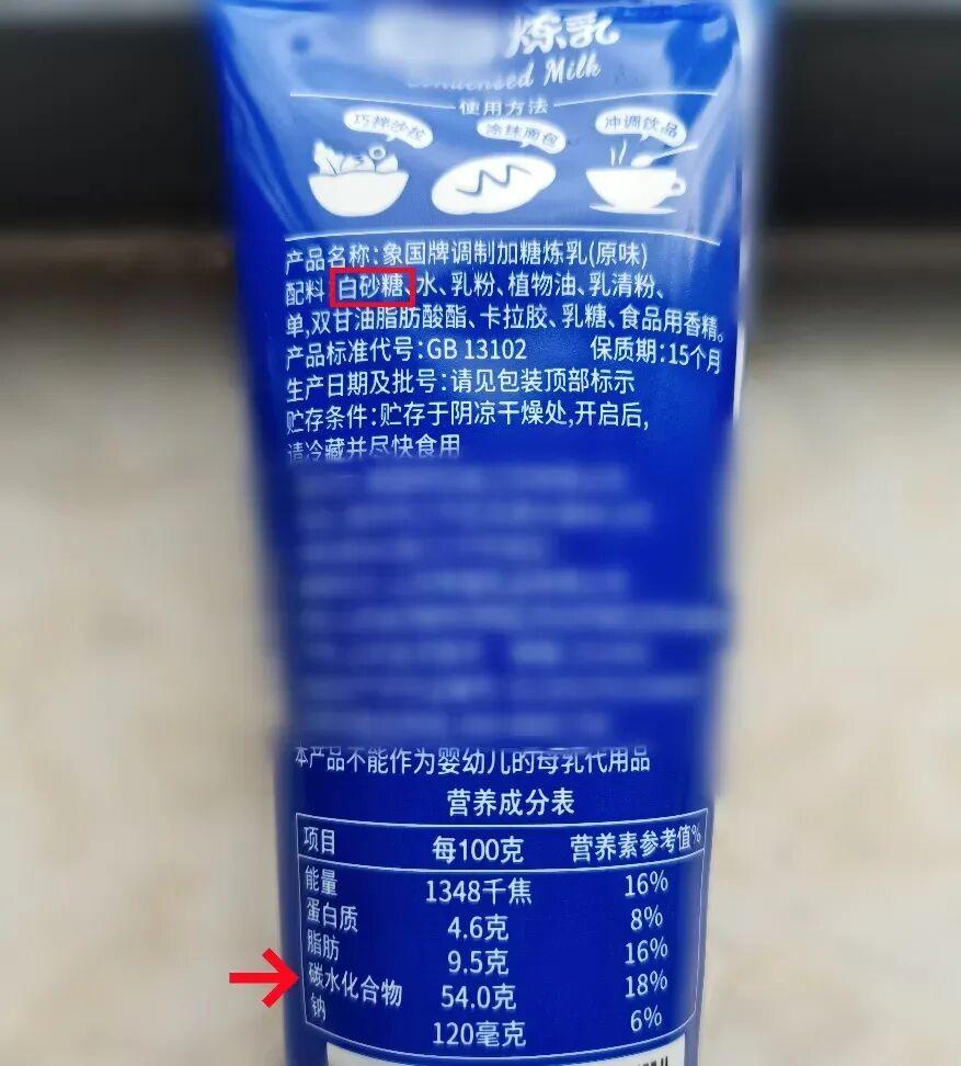 比如下圖這款煉乳,配料表第一位就是白砂糖,根據我國《預包裝食品標籤通則》的規定,配料表中的成分應當按照添加量由多到少的順序排列。意味着在這款產品裏,白砂糖的添加量超過了乳粉;再看營養成分表,每 100 克含有 54 克碳水化合物,雖然牛奶本身含有天然的乳糖,但含量通常只有約 5 克/100 克,所以大部分碳水化合物都來自於額外添加的白砂糖。